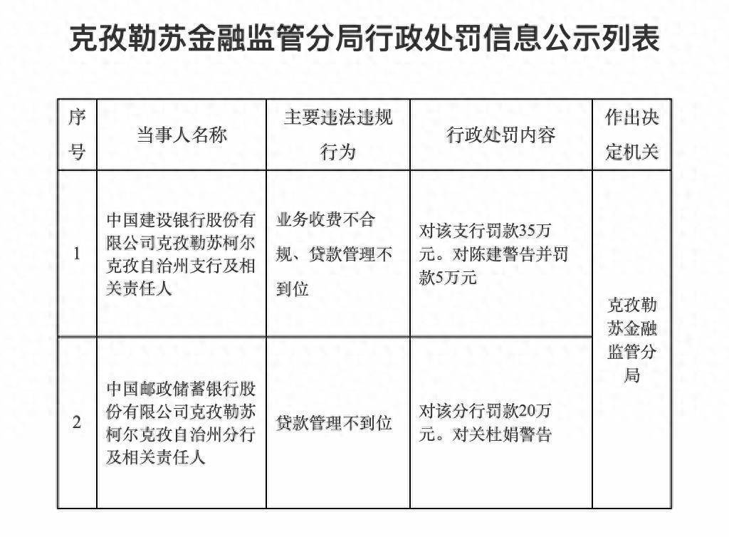 因业务收费不合规、贷款管理不到位,中国建设银行克孜勒苏柯尔克孜自治州支行被罚款35万元,相关责任人陈建被警告并罚款5万元。